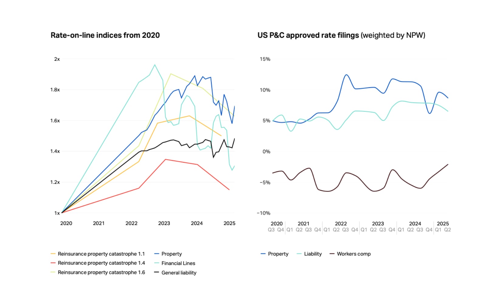 The charts below are from Howden Re’s report. The left is on a cumulative basis worldwide, and the right is the US rate filing picture.